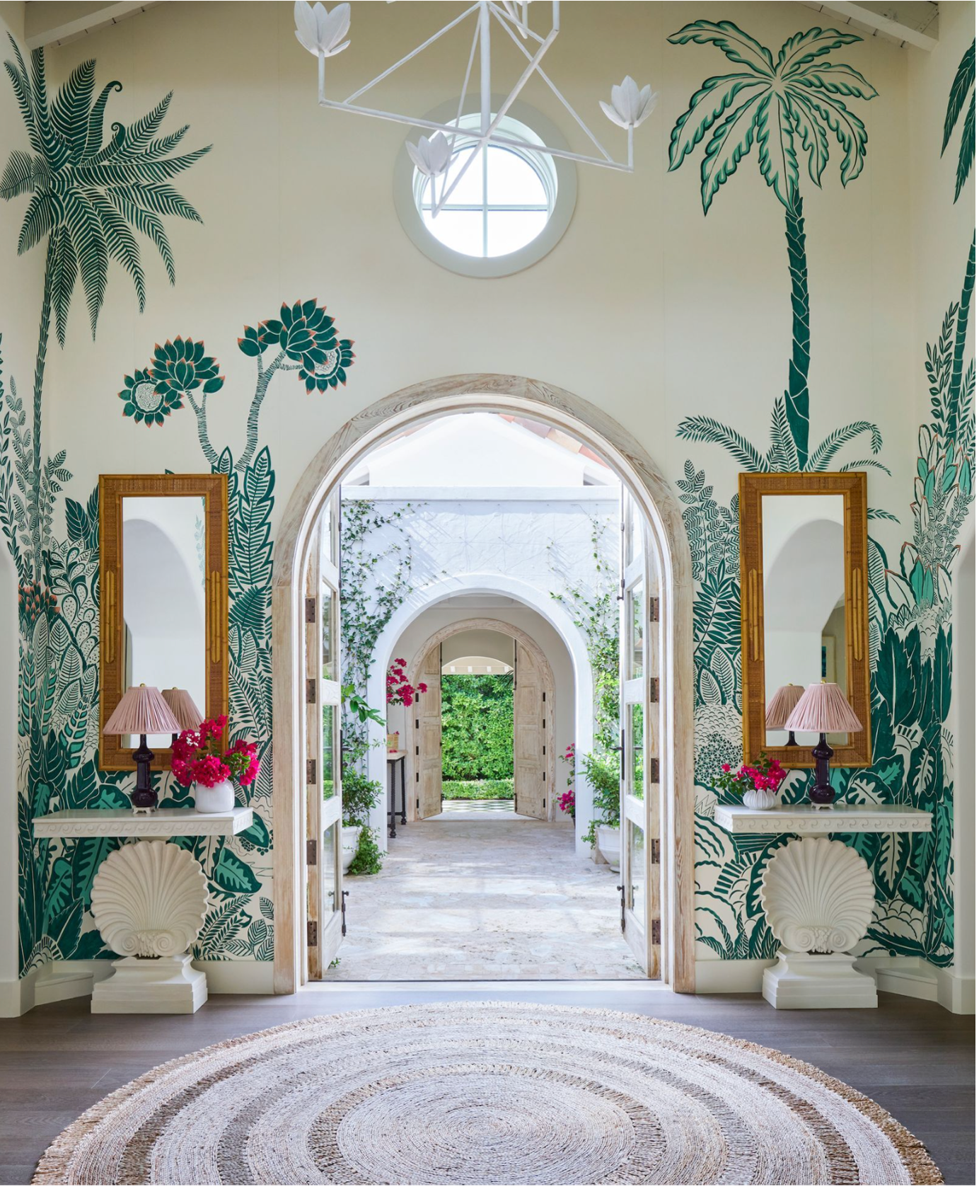 This Miami project by Ashley Whittaker Design, as featured in AD Italia, uses the interior as a deliberate frame for the landscape beyond. The de Gournay wallpaper blurs the boundary between inside and out, extending the garden’s presence into the home itself.