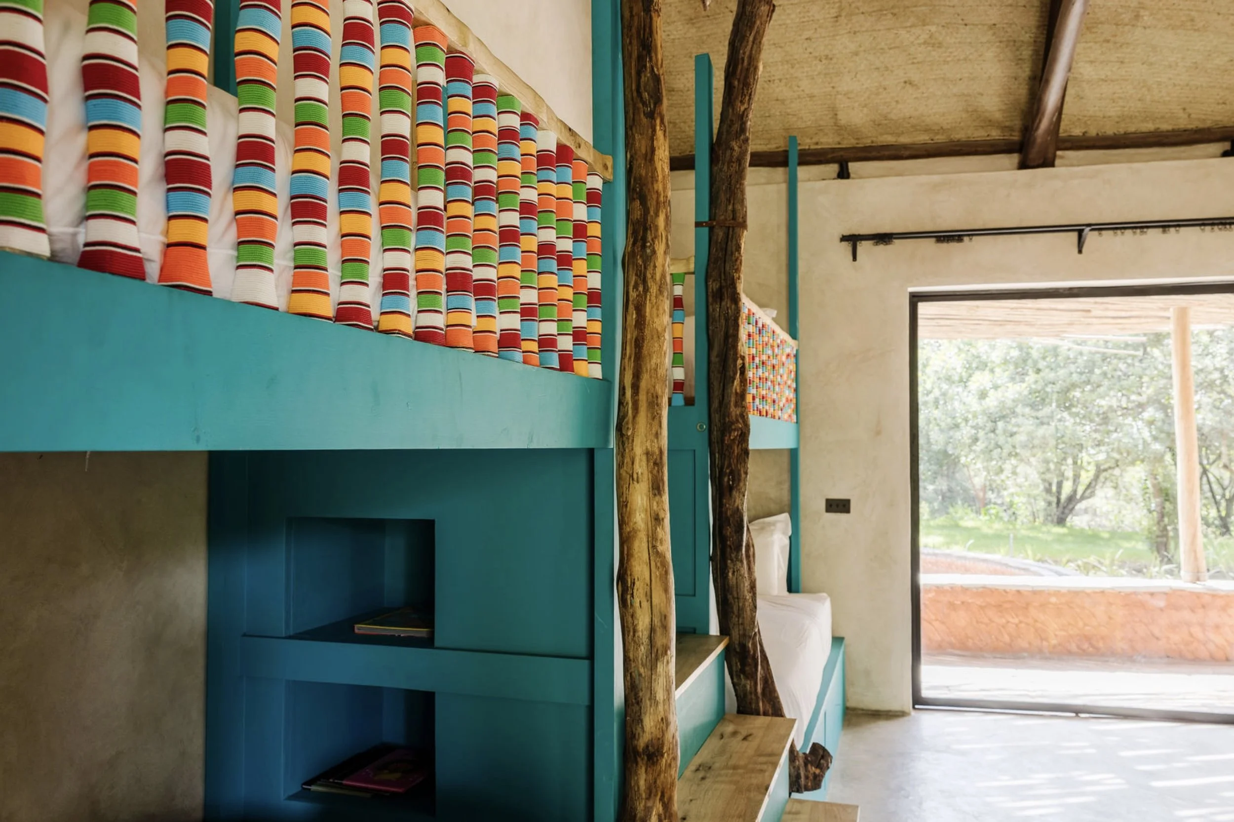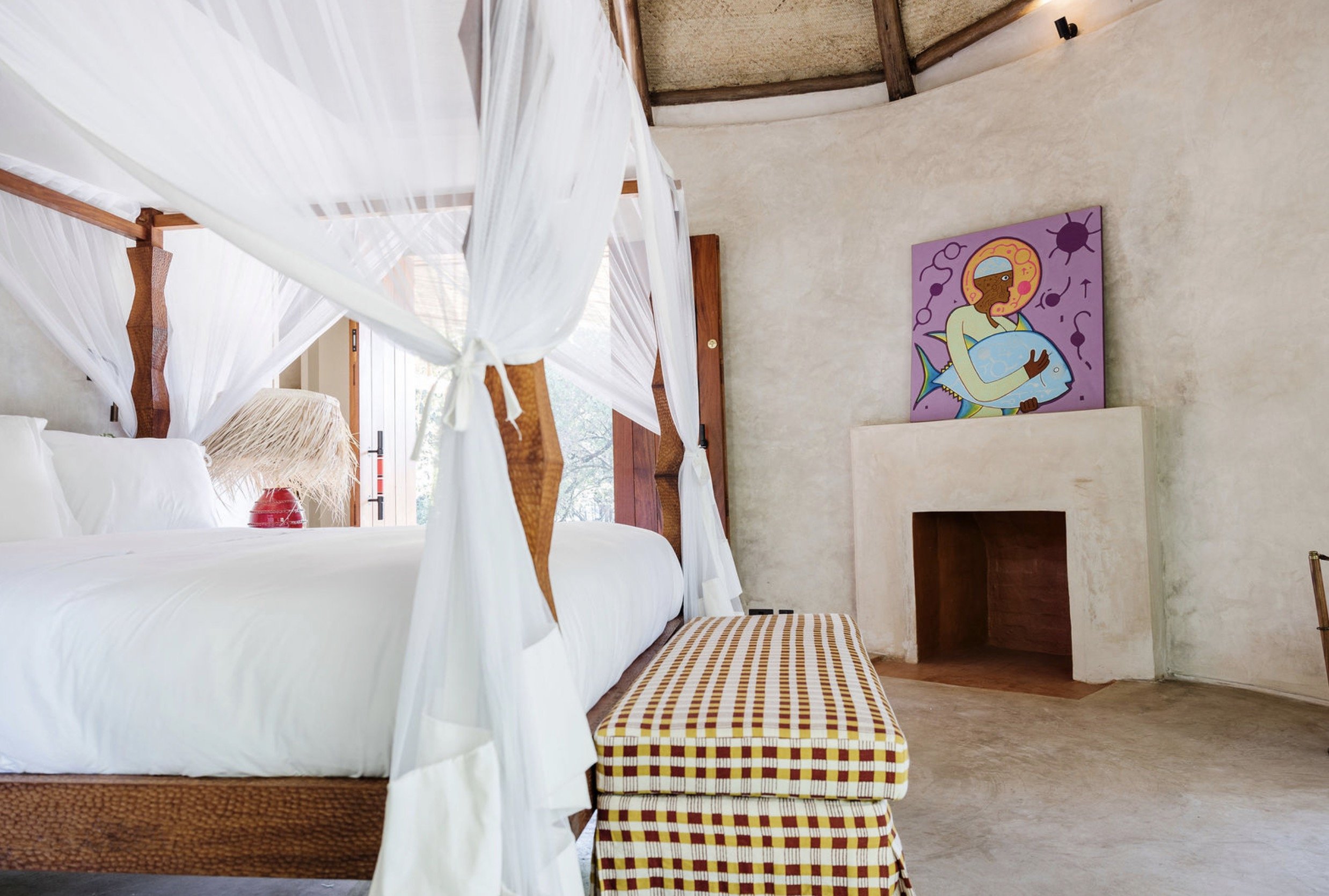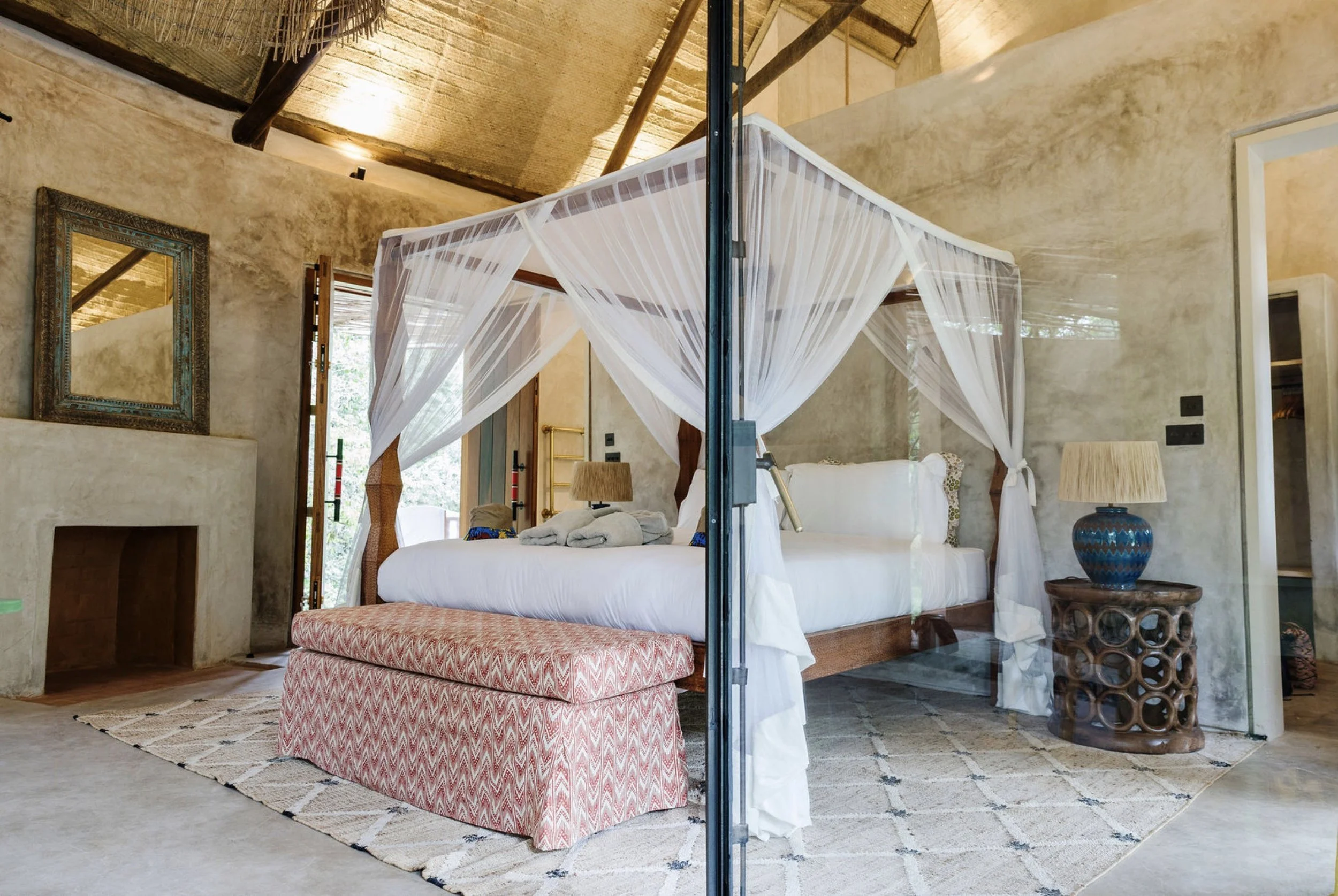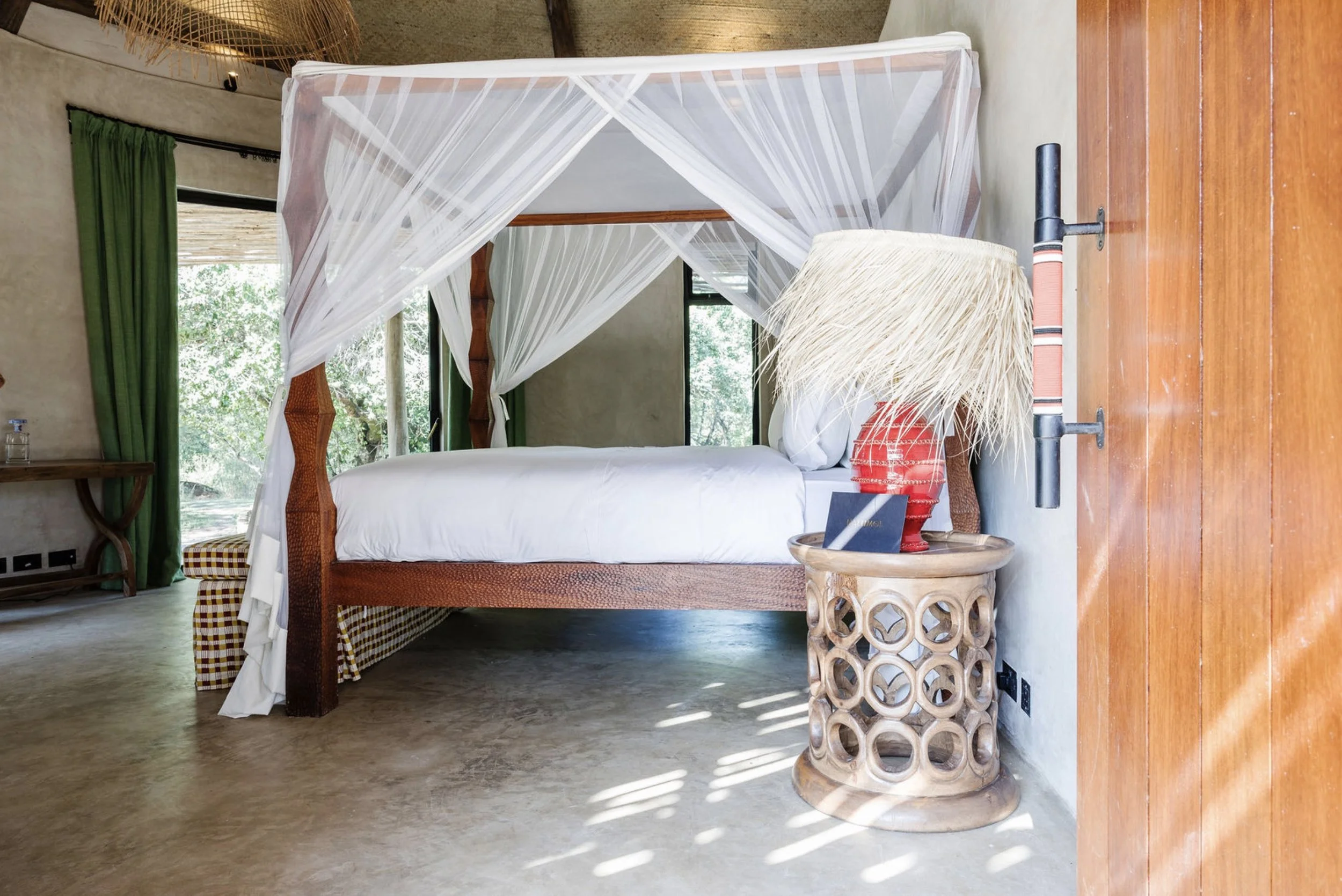 Set on a curve of the Mara river in a private reserve, this family home is surrounded by the incredible wildlife of Kenya. The house is made from local natural materials and techniques which we have carried through into the interiors and combined with vibrant colours and patterns. All the spaces feature soaring views up to the thatched roof and custom furnishing including a bar with hand beaded elements beautifully made by Masai craftspeople.